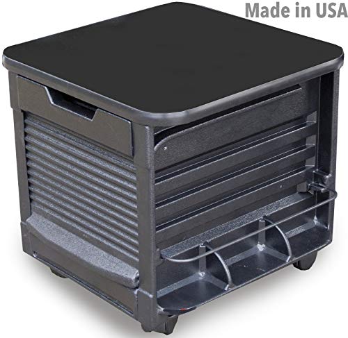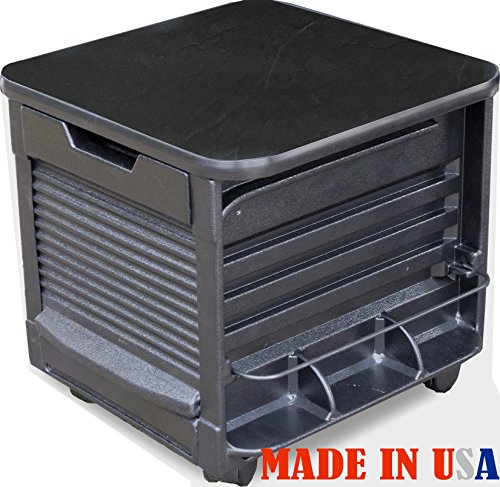 Professional Pedicure Stool Unit Made in USA by DINA MERI leader in Salon equipment manufacturing. This unit features: ABS Thermoplastic Polymer Body, Melamine Black Laminate Top/Seat,, 2 assorted trays, "easy-roll" roll-up door, 2 side Shelves with "tip-preventing" dividers and wire support for additional product storage. (some photo may show unit "at work" with product not included) Color: Black. Overall Dimensions: 15"w x 15 1/2"d x 16"h, Weight: 14 lbs. IMPORTANT: This pedicure is designed to hold up to maximum 220lbs, it does not have locking wheels, therefore on a smooth floor it might slide away, Seating and Rolling on a rough tiled surface is not recommended.
