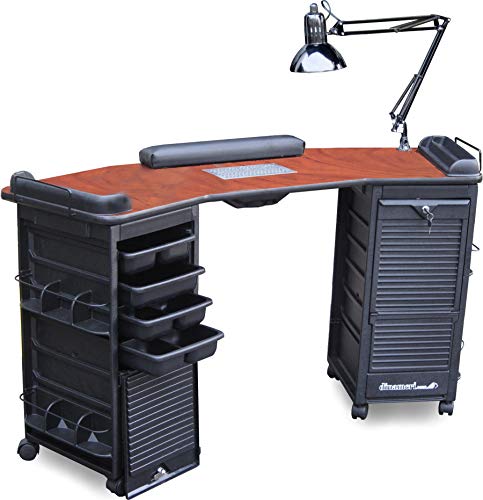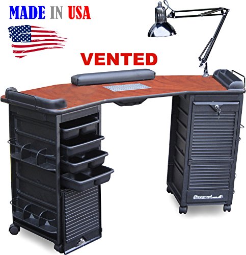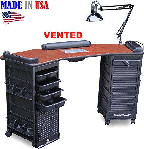 Professional Nail Table Made in USA by Dina Meri leader in Salon equipment manufacturing. - FEATURES: Dina Meri Active Charcoal vent system (helps reduce Odors/fumes*), Cabinets in ABS Thermoplastic Polymer Construction, Each with 4 assorted trays and 2 Exterior side pockets for additional product storage, "FLIP N FOLD lockable door for added security, Tween Hooded casters for easy mobility. Angled Top Features: Large work surface in Acetone Resistant High pressure BLACK laminate, Tray Support to clip any of the enclosed trays, adjustable Swing-arm Lamp, 2 Polish racks Padded Armrest. Overall Dimensions: 16"D x 60"W x 30"h Weight: 55 lbs. Note:some photos may show table at work with products not included, *Vent system is not designed to be a Vacuum for dust. Odors are "reduced" not 100 % eliminated.